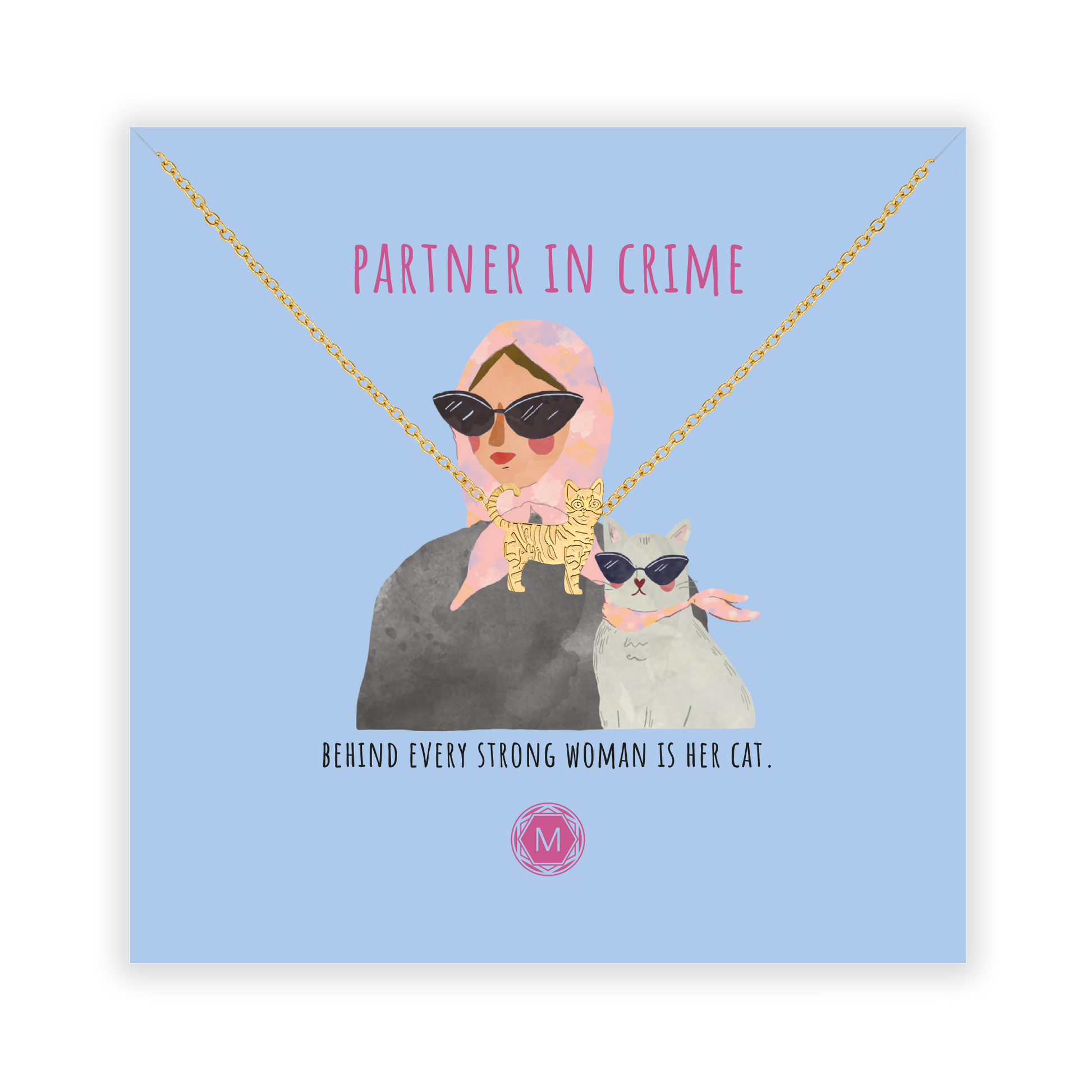 La nostra collana 'PARTNER IN CRIME' è più di un semplice accessorio – è un simbolo di donne forti e del loro legame indissolubile con i loro gatti, che le sostengono sempre. Perfetta per chi sa che la vera forza risiede anche nell'amore e nella lealtà verso il proprio partner in crime a quattro zampe.